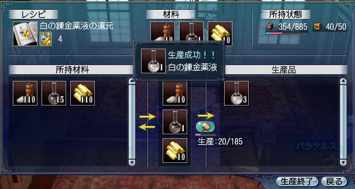 続いて「白の錬金薬液の還元」レシピで塩・黒薬・金から白薬を作ります。